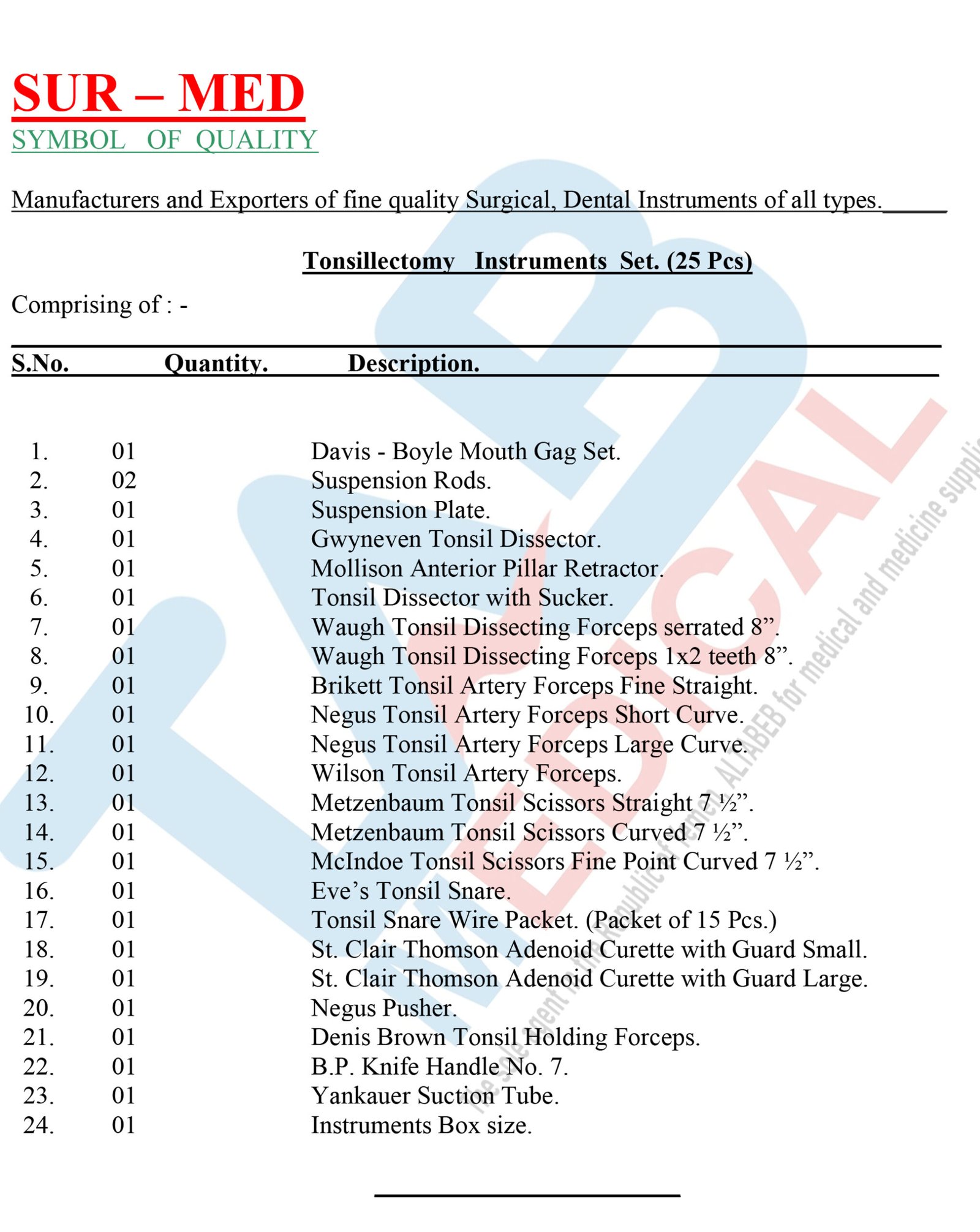 Tonsillectomy Surgery Instruments Set. (25 Pcs).